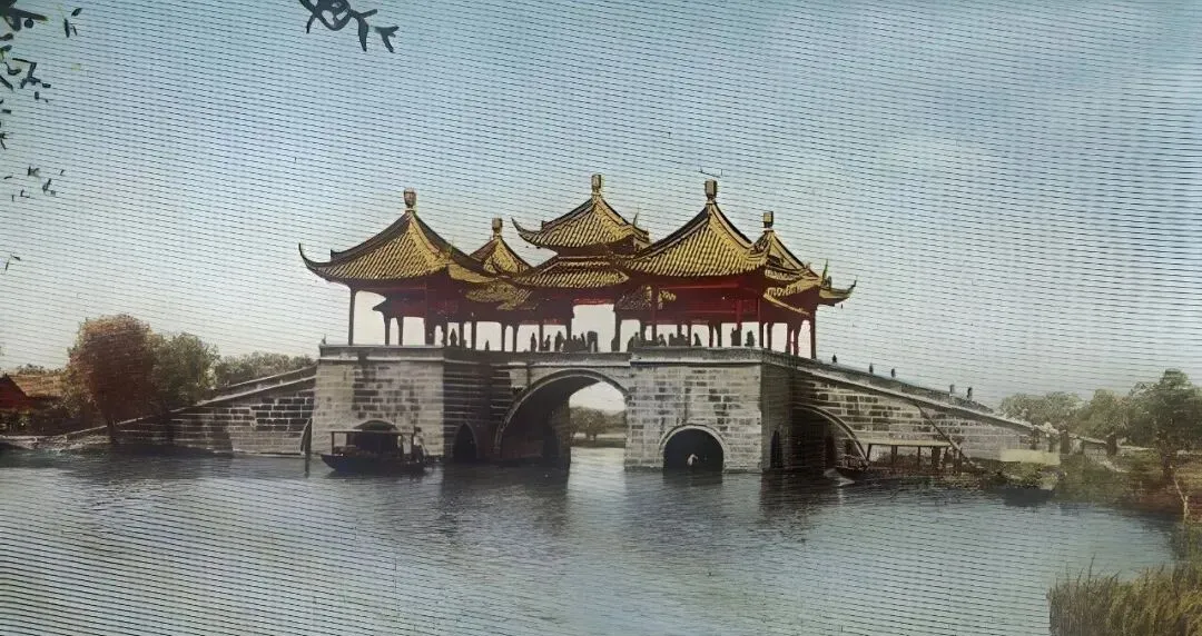 这就是扬州五亭桥,桥身是青灰条石砌成,桥洞三个,亭子五座,黄瓦在日头下像抹了油,桥面上人站成一排看水,船从桥洞里慢慢穿过去,桨叶拖着一道水脊,没什么话,好看就对了。