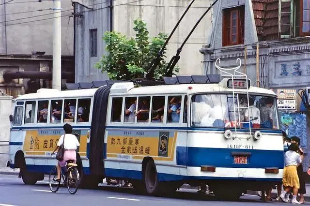 图为位于上海长乐路的陕西南路站,是26路的公交车站点。在上个世纪90年代初,上海公交车年客运量达到近50亿人次,每年行驶的里程有100多万公里,拥有408条线路、6562辆公交车的规模。