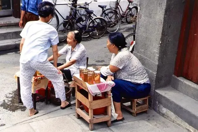 图为夏天,两个在街边卖茶水的老人。在街边放一个凳子,摆几杯茶水,路过的客人如果渴了,可以到小摊上喝一杯,那时候一杯好像是一毛钱左右。