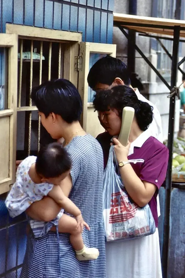 图为在街边的公共电话亭排队打电话的人们。在上个世纪九十年代,公共电话是人们的主要通迅工具,90年代初也流行BB机,但是回电话还是要用到公共电话。