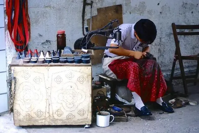图为路边的一个修鞋摊,一个修鞋匠正在修鞋。曾经这种修鞋摊遍布城市里的大街小巷,在那个物质匮乏的年代,一双鞋子坏了要修修补补好几次才舍得丢掉,所以那个时候修鞋匠遍布在各个角落。