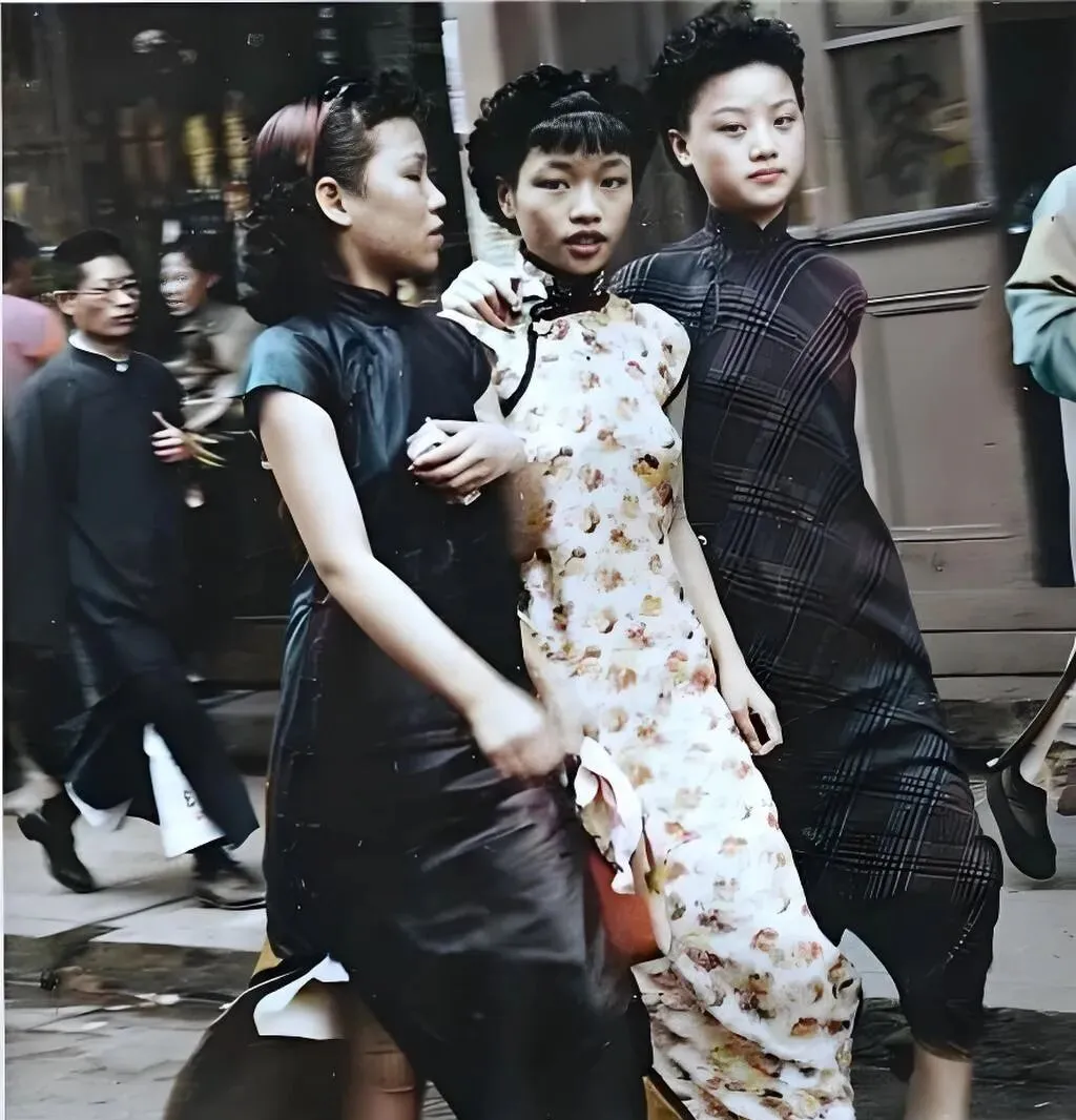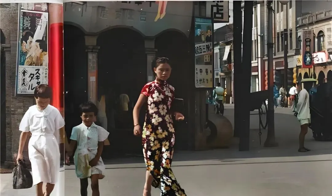 这个纤细的手拎包叫坤包,小巧的皮面擦得锃亮,女人腕上一绕就走风了,旗袍领口贴着颈子,花团锦簇的缎面跟着步子一晃一晃,两个日侨小姑娘拎着东西慢慢走,街口电线杆影子拉得老长,招牌上密密麻麻的字像在吆喝生意,那时候过马路可没红绿灯,靠的是眼观六路脚下留神。