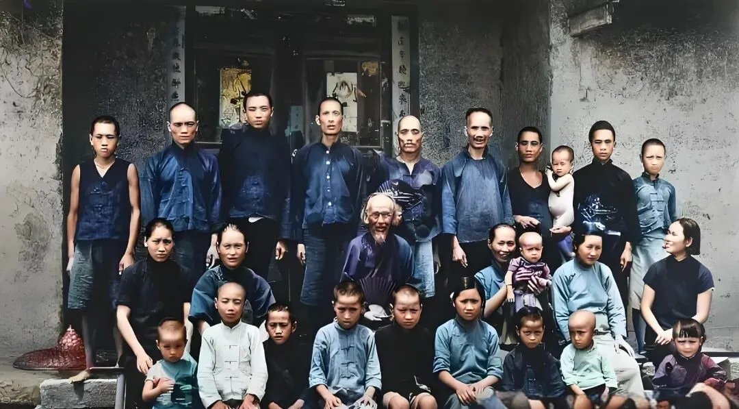 图中门楣上那对木刻叫楹联板,黑底金字,边上还压着灰,屋檐下的土坯墙起了皮,穿蓝布褂的一大家子坐站错落,最中间的老爷子手里团着折扇,孩子们剃着毛寸排成一排,奶奶说那年秋收刚过,家里忙完把人都叫回来拍一张,照相得蹲着不眨眼,拍糊了可就白忙活。