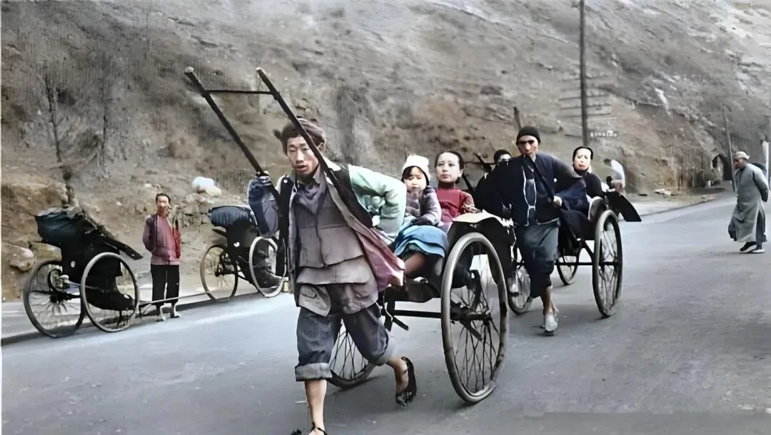 图中这种两轮人力车就叫黄包车,前杠是两根硬木,握把裹着布条防滑,车厢里坐着一大一小,毯子铺在膝上,车夫脚板拍在路面上啪啪响,山路起伏大,坡一陡他就把身子往前探,膝盖像弹簧那样一屈一伸,妈妈说以前出门看病就靠这个,夜里回家路黑,得嘱咐一句师傅慢点,别磕了石坎。