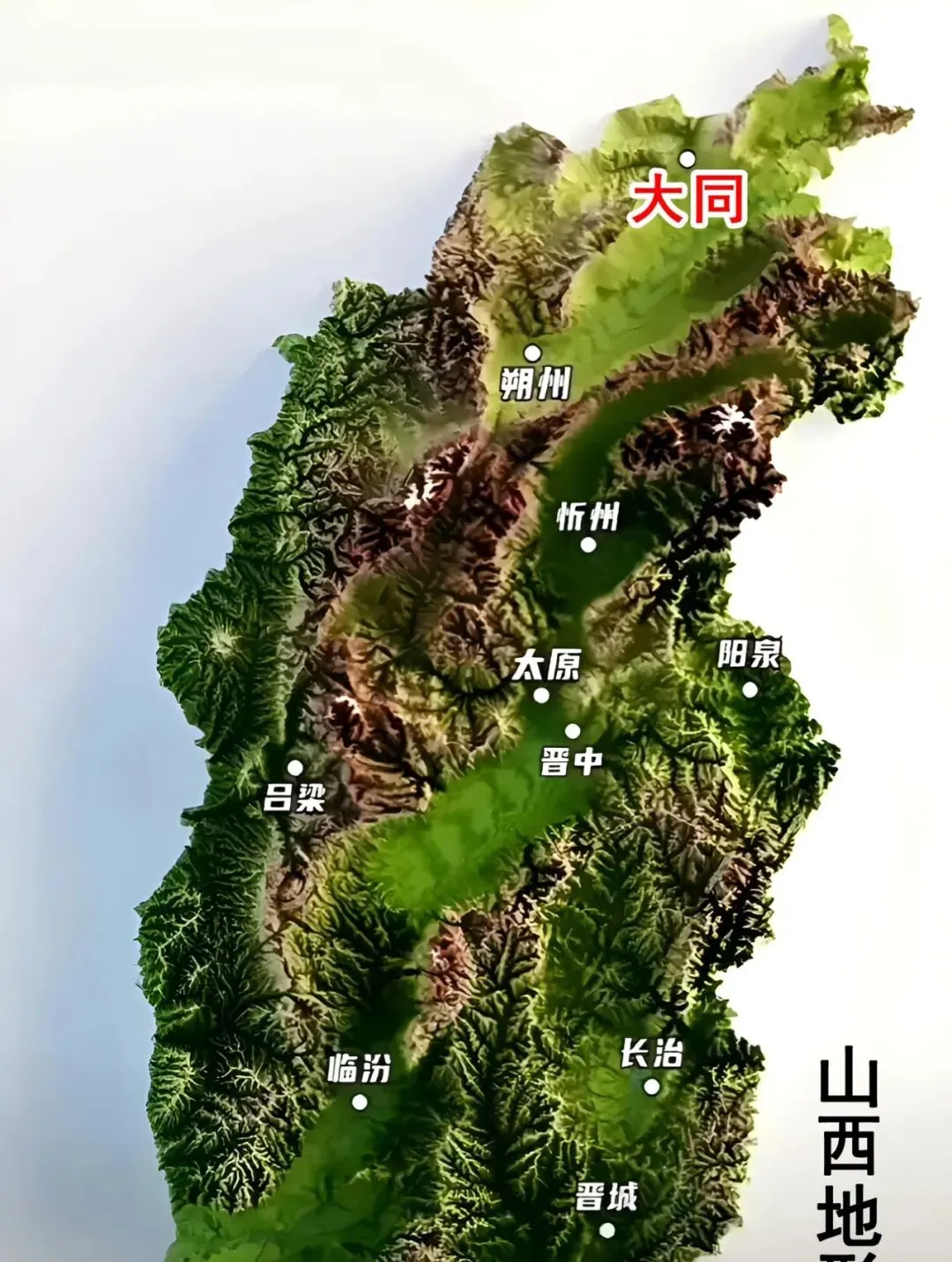 图中这张起伏明显的地形图叫山西地貌图,绿色带子往北拐的尽头就是大同,夹在山梁与盆地之间,风从口子里直灌,难怪小时候奶奶老嘀咕别往风口站。