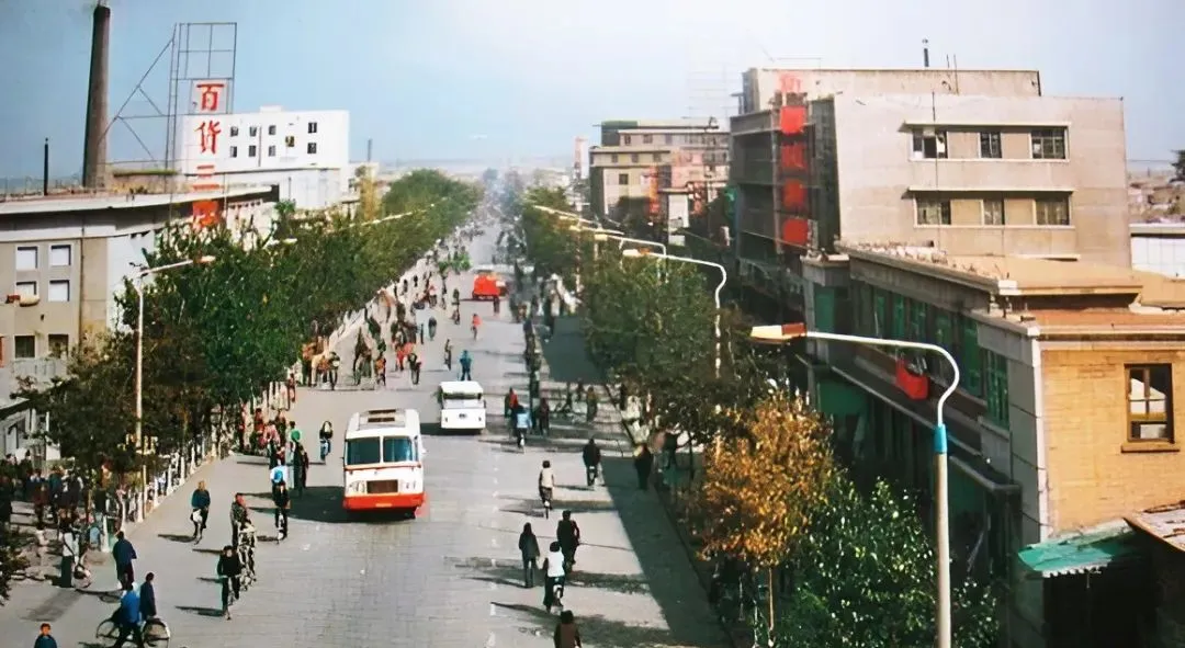 这条笔直的大路叫大西街,两边梧桐拉成阵,路中间红白相间的公交一拐一拐,商场招牌“万华”立在屋顶,彼时买块呢料回家让裁缝做套中山装,走在这条街上挺精神。