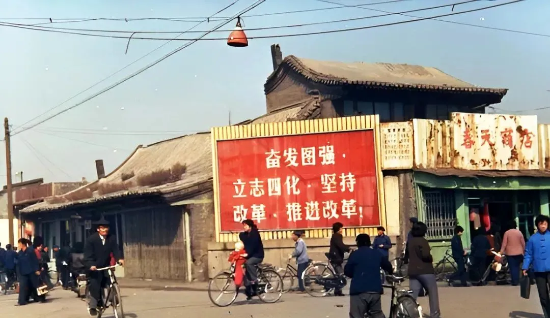 红底白字这面大牌子叫宣传标语,旁边的“春天商店”铁皮招牌已经起锈,巷口停满自行车,街坊一围就能从油盐酱醋聊到厂里的分房名额。
