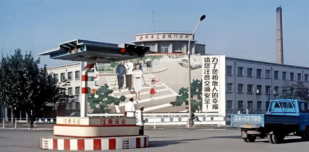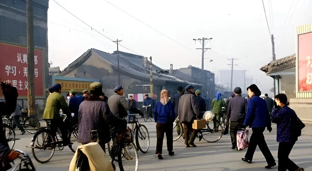 这张转角的街景里,红字标语照样醒目,骑车的人多过汽车,布袋油壶往车把上一挂就出门,那个年代一辆自行车就是家里的腿。