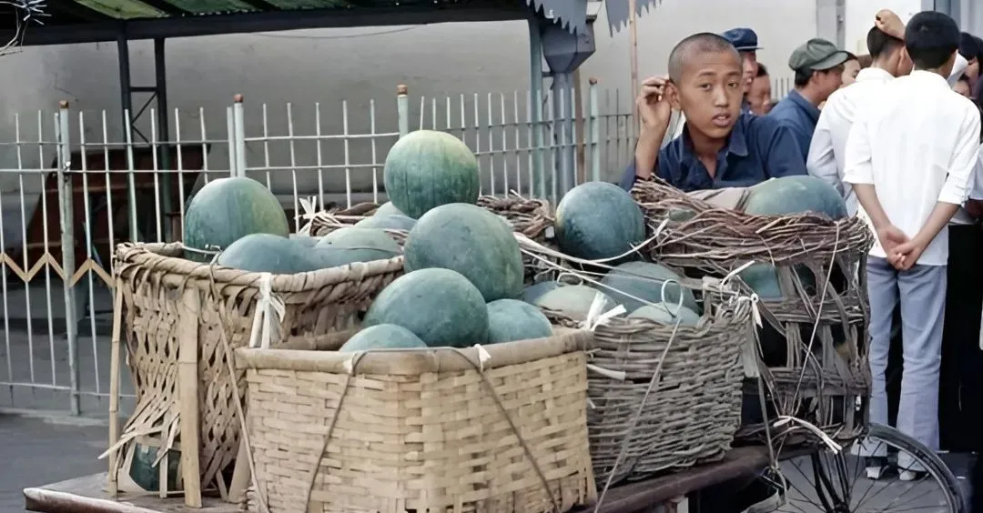 车上两口大筐装的是西瓜,瓜皮发着灰绿的蜡光,小伙子剃着板寸,一手扣着耳朵听价,刀一抡开瓤就甜得发脆。