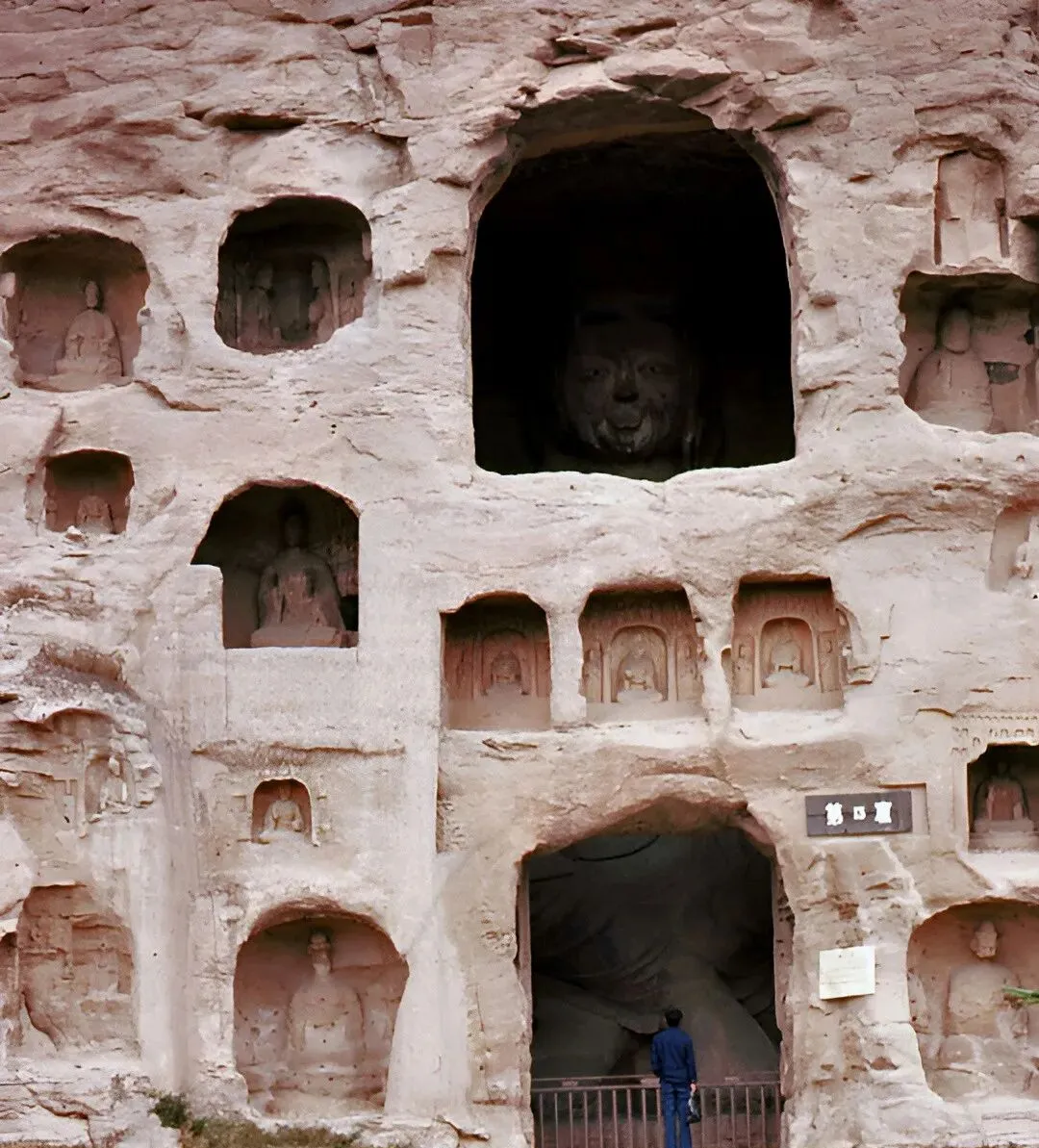 洞口巨大的佛首在第五窟里探出来,游客站在栅栏前像个小豆点儿,沙岩的肌理起伏得像水波,风一吹粉末落在肩上,母亲会拍拍说别靠太近。