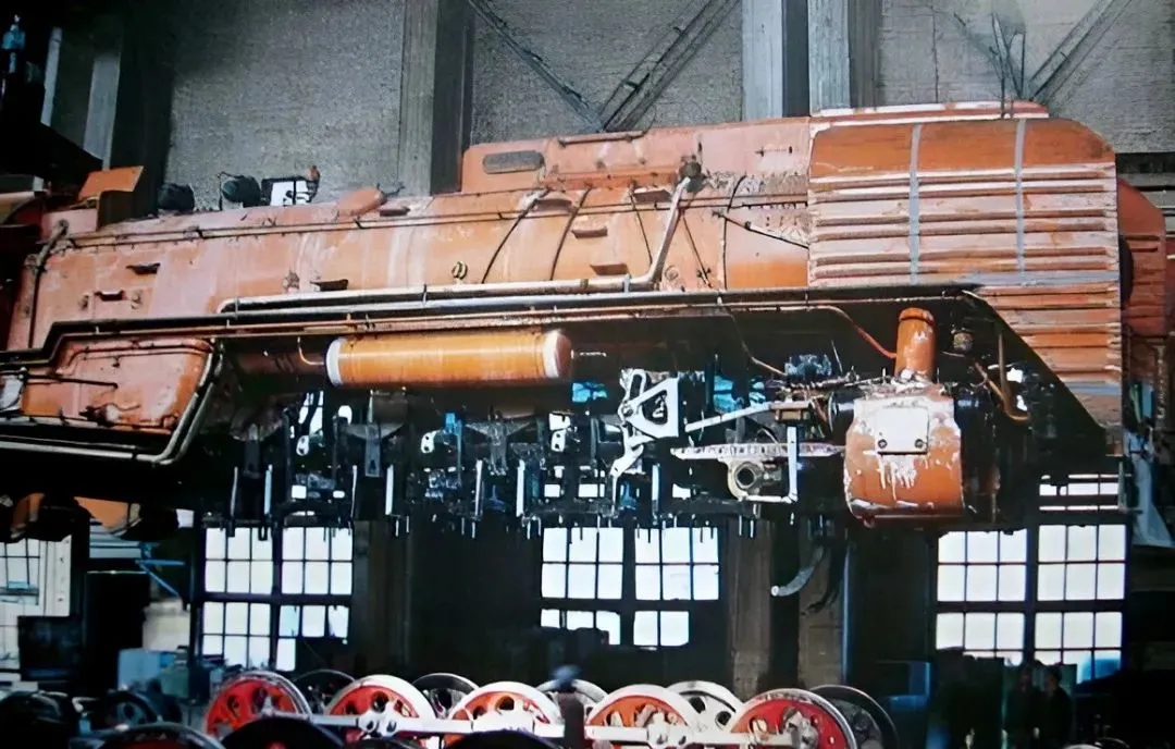 这台橘红色倒挂着的叫机车车体,行吊把它稳稳托住,底下是摘下来的动力轮对,师傅仰着头对准螺孔,扳手咔哒一响,车间里回声轰隆。
