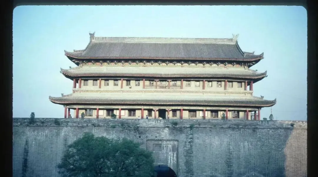 图里这座城门楼子气派得很,灰砖城台厚重,楼身三层檐牙高啄,柱子红得发沉,斗拱层层叠着像叠起的浪,傍晚光一打,木梁上浮出细细的纹,爷爷说,走南门进城挑水卖的年月过去了,可门洞上的风还是那股味。