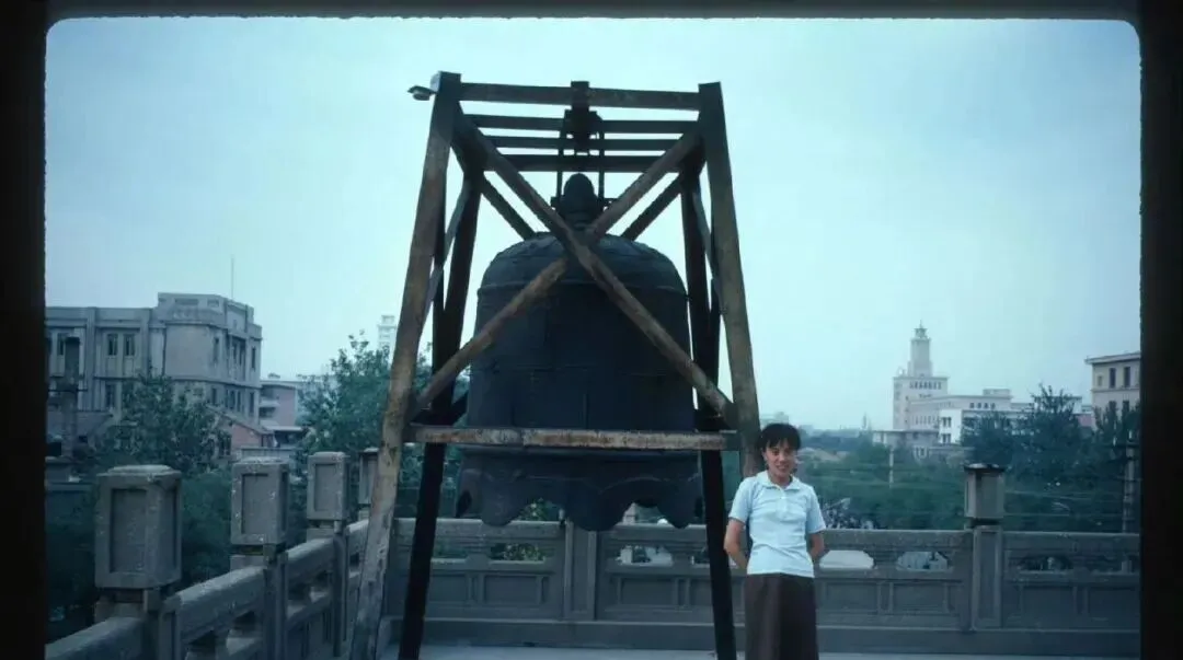 这是寺庙或钟楼角上的悬钟,木架斜撑,铁钟肚大沿口起波纹,少年站在旁边,笑得有点羞,导游叔叔敲钟前要先说吉利话,等锤子一落,嗡的一声,胸口跟着震一震,那种厚重的回音,现在多半只在录音里能听到了。