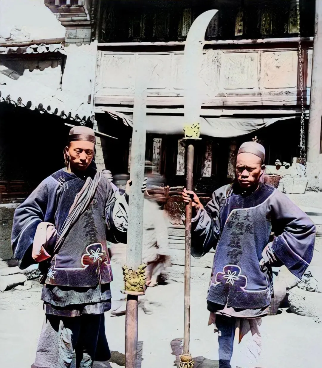 这两把家伙叫偃月刀和七星剑,刀脊厚重,刀首嵌着兽面金扣,两个守庙的人把武器立得直,衣襟上写着大法总领事,我第一次见这四个字是在旧戏单上,现在只剩照片能瞅了。