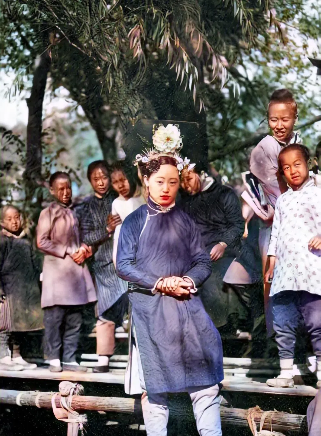 这位头上簪花的叫花会上表演的满族姑娘,脚下木板台微微颤,围了一圈孩子探着头看,新簪子在阳光下一晃,像是要滴下露珠,热闹就是这么聚起来的。