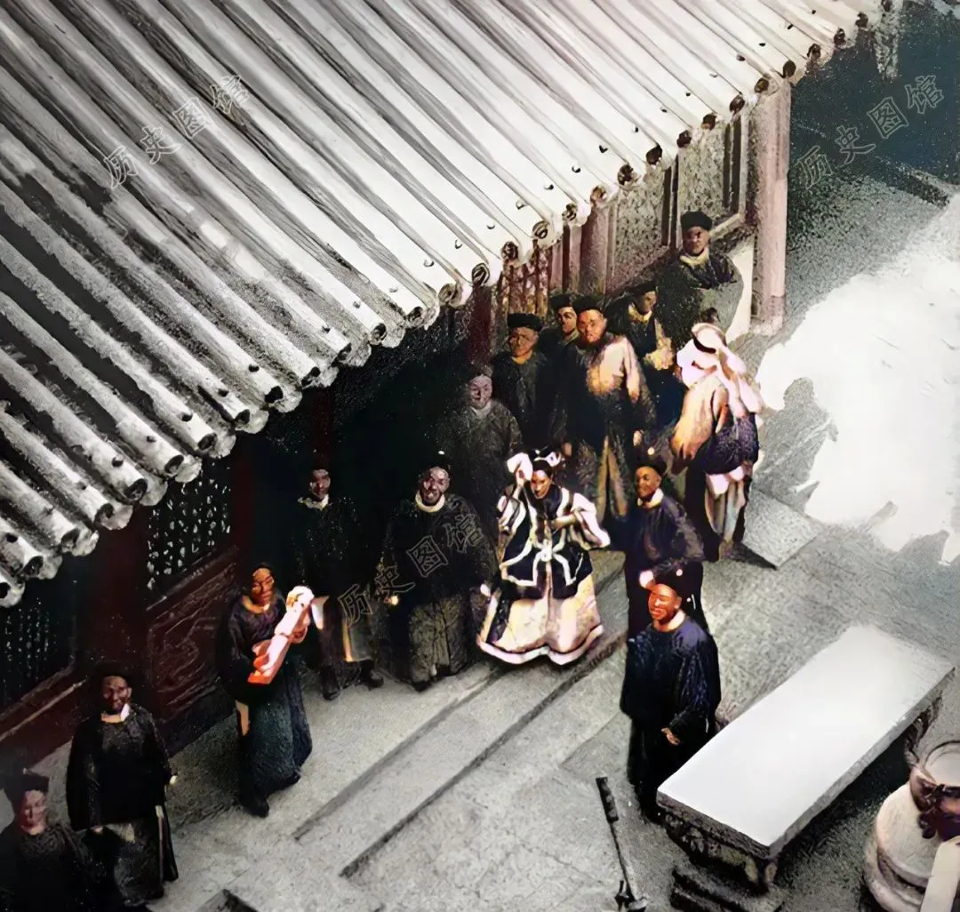 照片里这幕叫宫门抱福,有人怀里抱着襁褓,旁人掀着衣襟让道,檐头压得低,瓦当排得齐齐整整,喜事在旧时也怕招惹风口,所以笑都收着点儿。