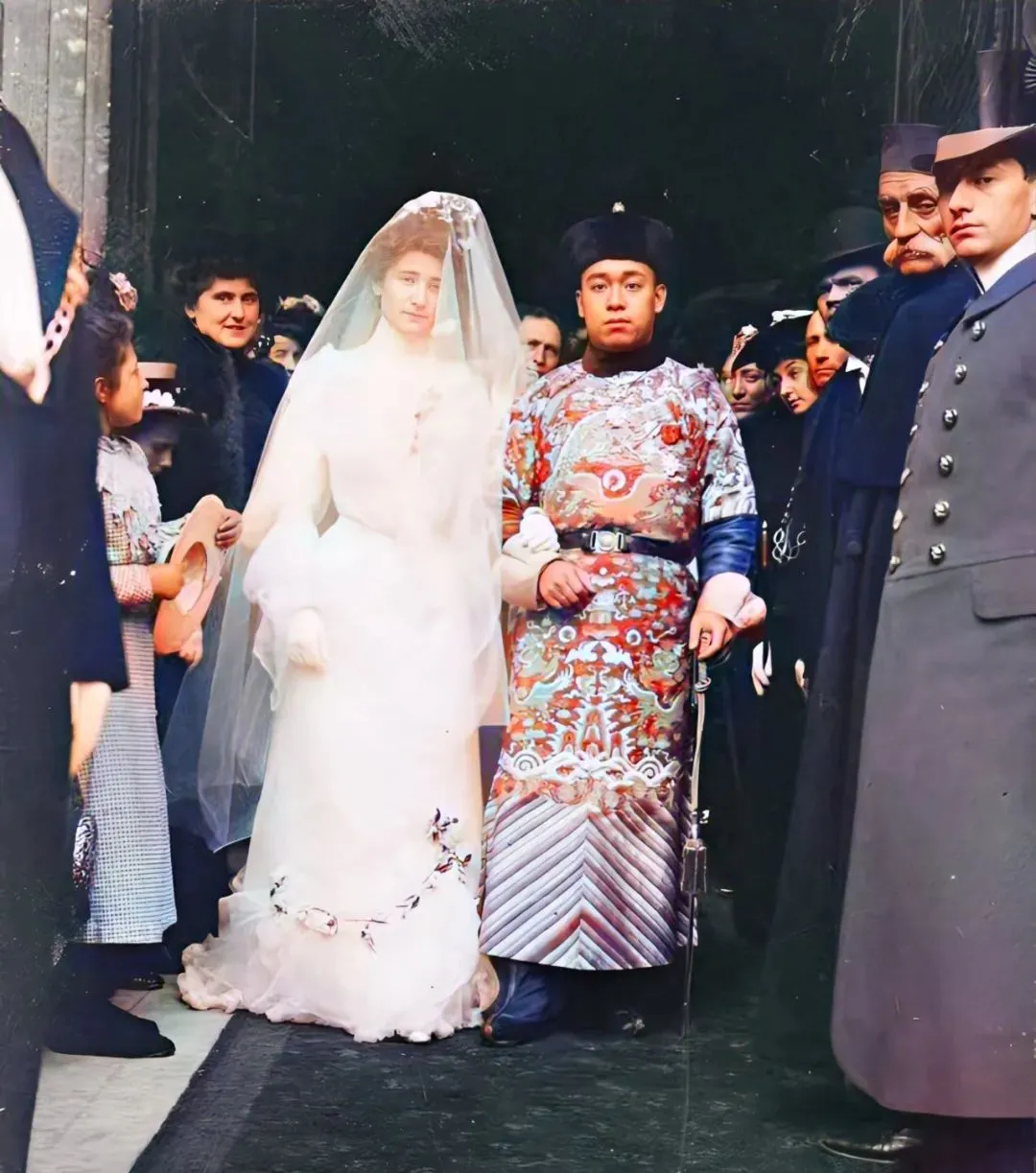 这对新人是跨国婚礼,一身凤纹补服配白纱长裙,门口黑压压的宾客望过来,新郎腰间别着佩刀,新娘手里捏着手套,笑容淡淡,故事开得绚,合上书页却清冷。