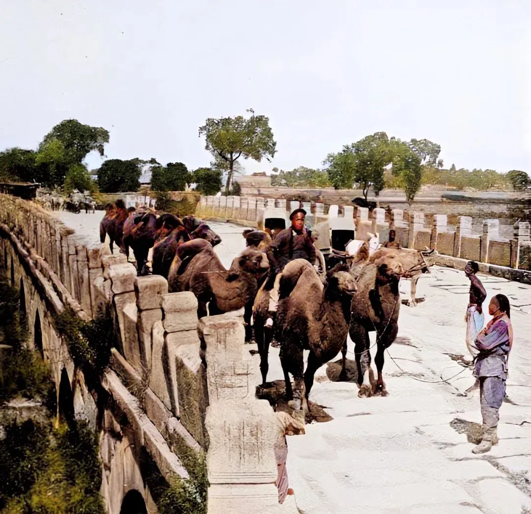 这个队伍叫驼队,铃铛一串一路叮当,驼背上的袋口系成死结,掌鞭人捏着绳头慢慢催,石桥的栏板磨得发亮,脚步声在桥洞里回响,像一口老钟。