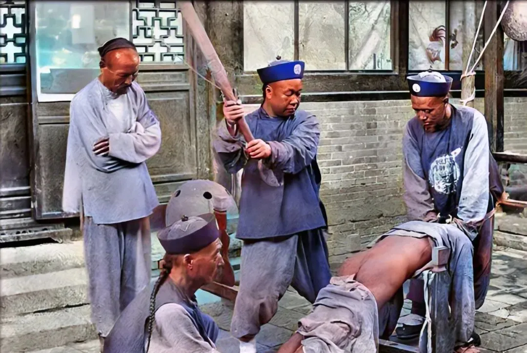 这套刑具叫杖刑木架,两头卡住手脚,行杖的人双手握柄抡圆了打,旁边有个师爷捋着胡子盯着,地面扬起灰,挨打的人闷声不吭,空气都跟着紧。
