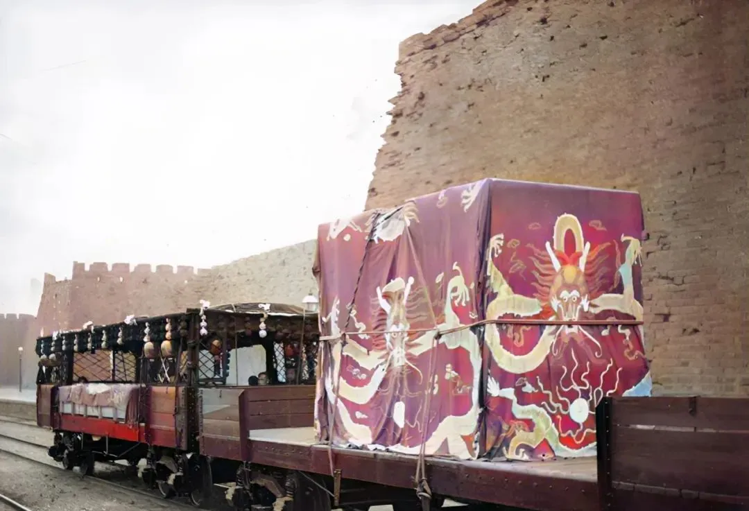 这节平板车装的是龙袍画像,外面罩着绣龙绸布,角落里用绳结勒成梅花结,护送的人坐在敞篷车厢里,火车贴着城墙慢慢走,现在看像一场远行的仪式。