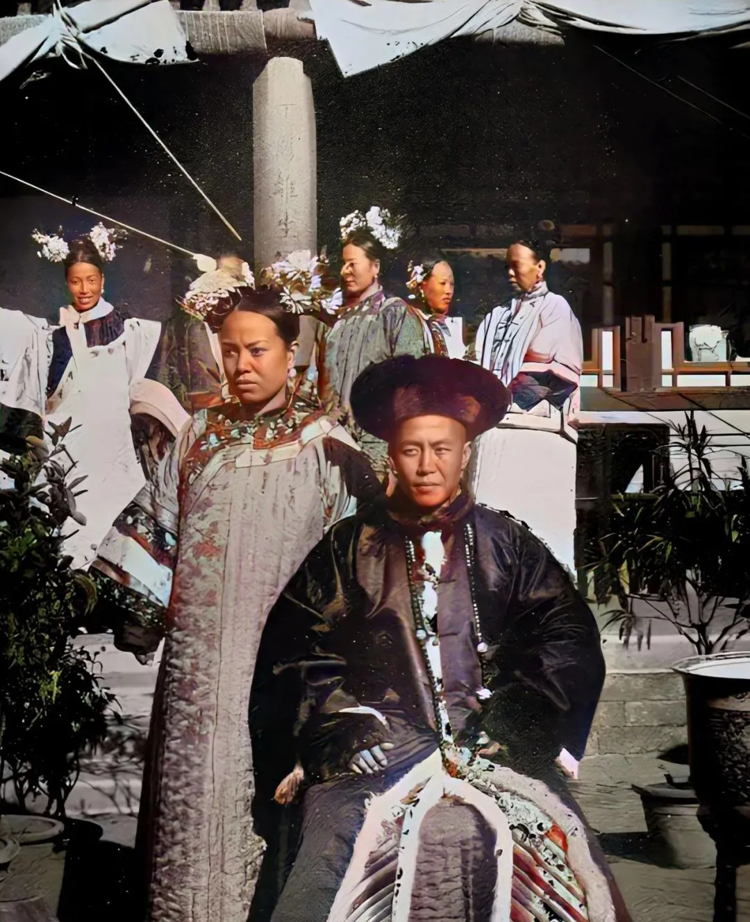图中坐着的人叫满族王爷,黑缎朝服一层层铺在椅面上,身后站着的女人簪花密密,院里竹影斑驳,像在一出家宴前回头一拍,眉眼里带着松弛。