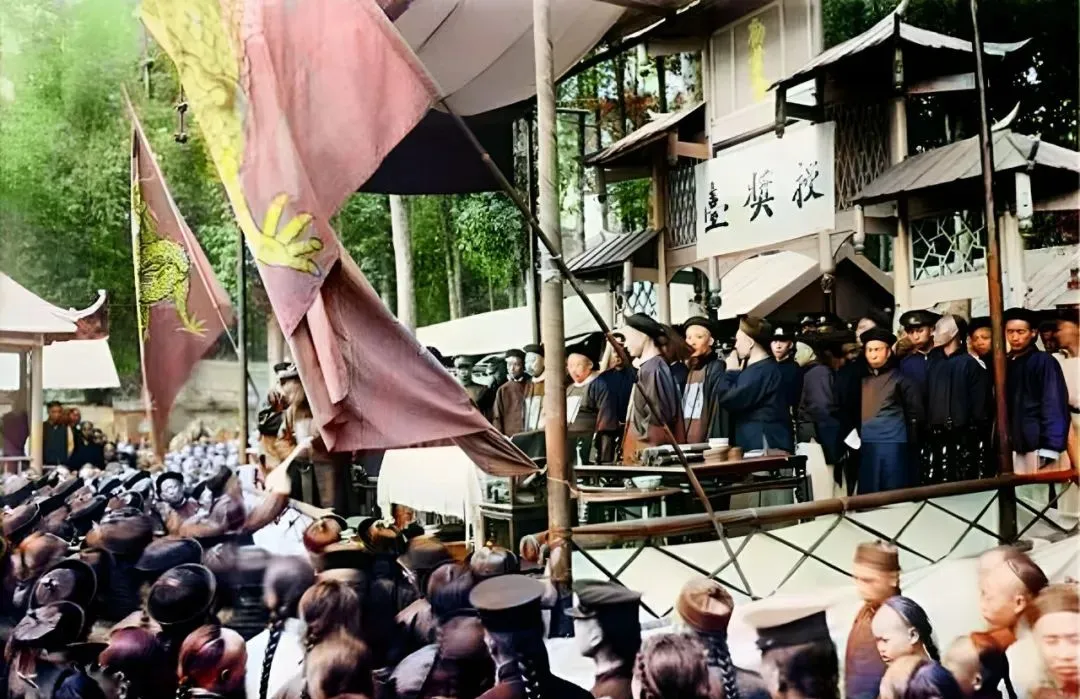 这阵仗叫劝业会授奖,旌旗把天都遮住半边,台上人声一浪接一浪,县里派来的先生还要宣读名单,我小时候在展销会上也挤过,喇叭里放的歌把人心里搞得痒痒的。