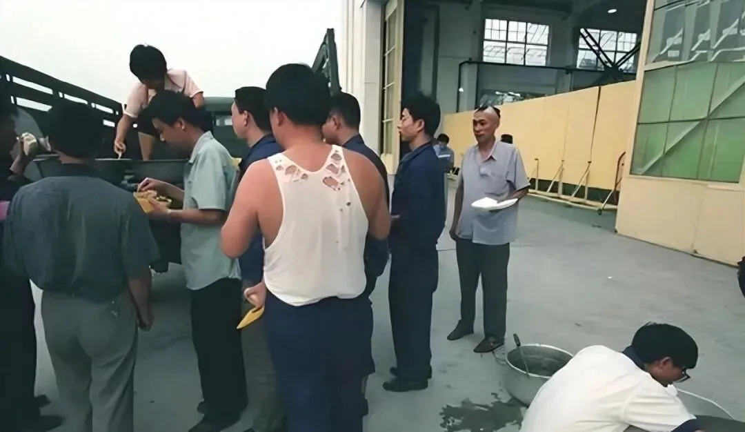 画面很普通:厂房外,一群工程人员排队打饭。环境简朴,地面不平整,旁边停着卡车。没有宣传横幅,也没有仪式场面。