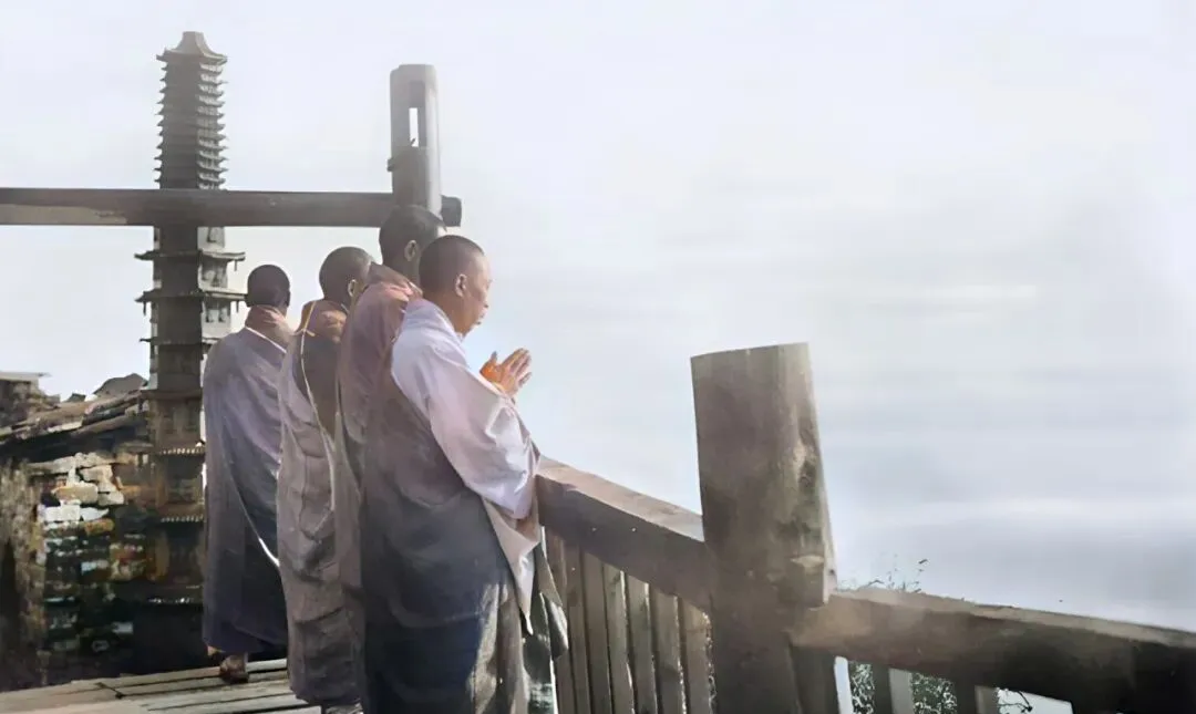 画面里站在栈道边的是几位僧人,灰褐色袍子披在身上,手合十朝云海念诵,身旁木栏杆被手摸得发亮,云雾像棉被一样涌上来,人声低低,山势高高,那一刻真有点出尘。