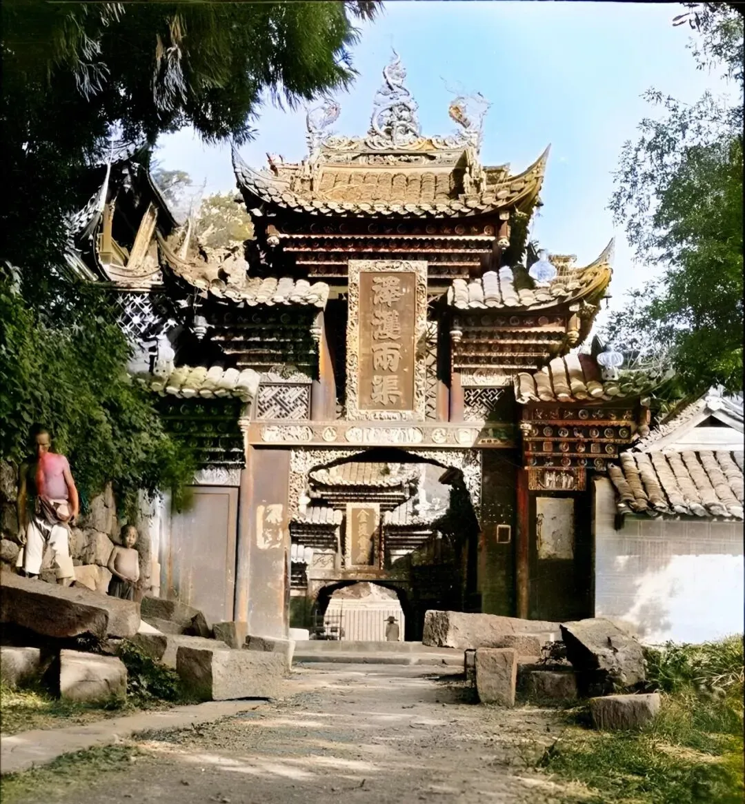 这个重檐牌楼在街口,瓦当卷着边,横梁上红漆还在,门内又是一道门,石阶上有人背着篓子慢慢上去,旁边小孩跟着蹦两步,笑声直往檐下钻。