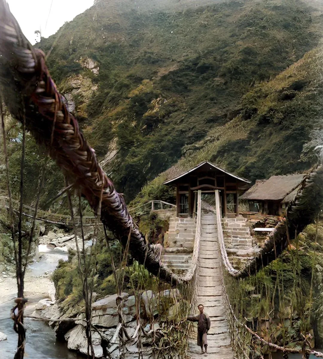 这两条并排的叫双索桥,粗藤拧成主绳,细绳织成网兜样的护栏,桥亭守在两头,男人提着箩筐从中间走,脚下木板咯吱咯吱,是紧也得过,慌也得过。