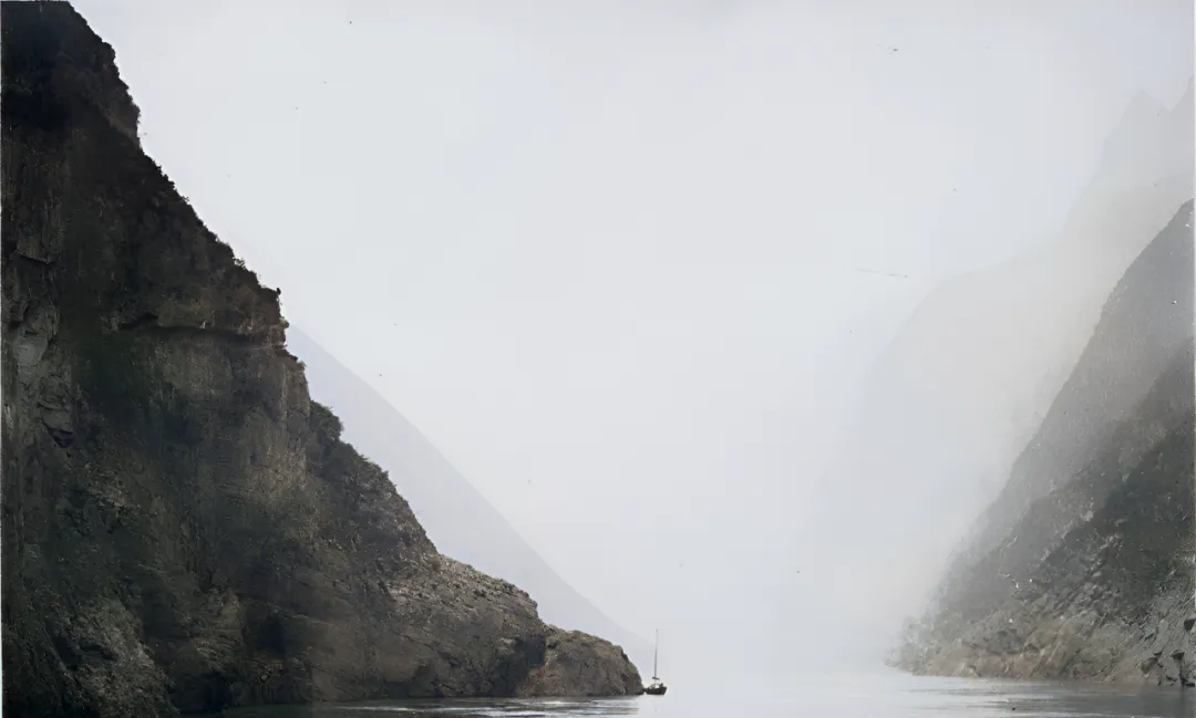 这段峡江就是巫峡,山墙一样立在两边,水道被雾气抹得发白,远处一只小帆船慢慢划过来,帆像一片叶子,古人写巴东三峡巫峡长,你现在站船头念一遍,也还是那个味儿。