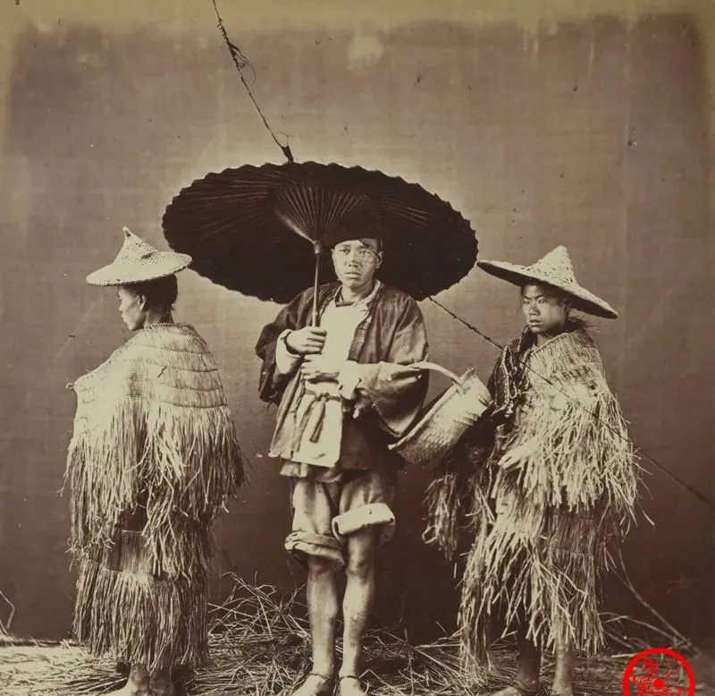 草编的蓑衣披上身,稻草一缕一缕坠着水珠,头上扣个尖尖的笠帽,最中间那位撑着油纸伞,伞面被雨砸久了留着暗暗的油光,脚底下稻草铺作地毯,几个人像刚从田埂上折回来,爷爷说下大雨时,蓑衣一披就能下地干活,不怕,回家门口一抖,哗啦一地水,火塘边烤一烤又能接着使。