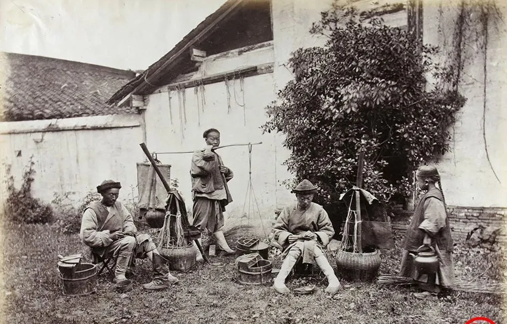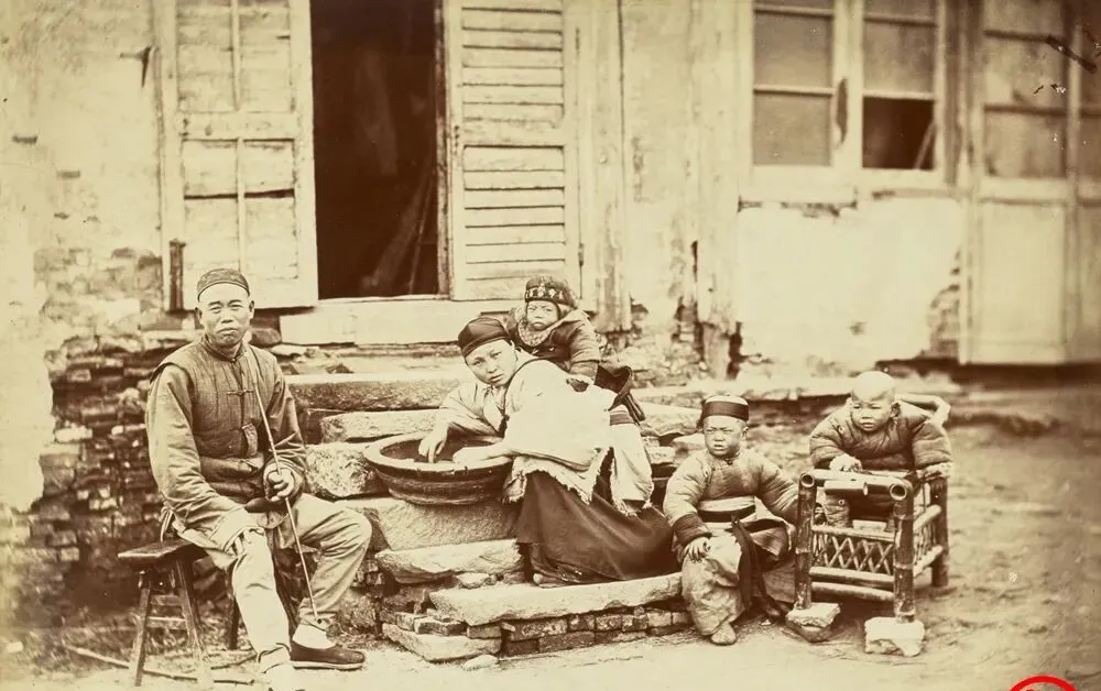 老照片:晚清人物肖像和生活场景,妇女又看孩子又洗衣。