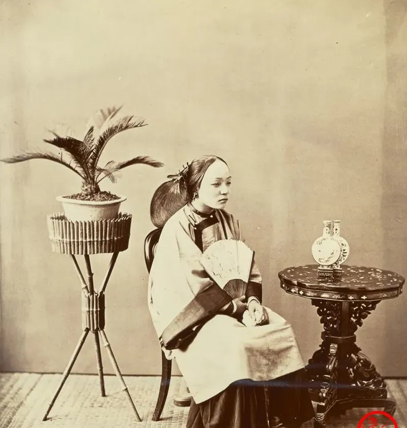 圆滚滚的大发髻用簪子别着,桌上搁一对白釉瓶,边上摆一盆苏铁,扇面是细细的宣纸,看着就轻,女子把手指收在袖口里,露一点手背,气定神闲,妈妈说这打扮多半是家里殷实,衣料厚,层层叠叠的边,坐姿是有人教出来的,现在拍照讲究抓拍,可那会儿照相得稳住不眨眼,像端茶接客一样认真。