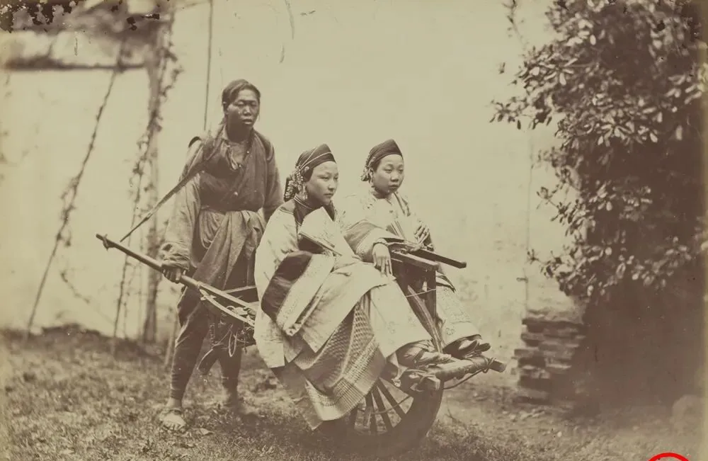 车把两头用麻绳勒着,车心一只黑亮的木轮,妇女并排坐好,脚尖搭在窄窄的踏板上,后头的车夫把肩膀往牛皮垫上一靠,双臂一使劲就能滚起来,爷爷说那年头轿子要养轿夫,太费钱,独轮车省力还快,过小巷能拐得过来,泥路颠一下,前头笑一声,后头就跟着笑一声。