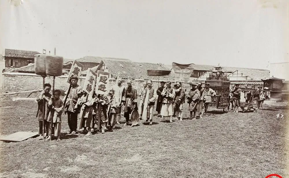 图中这一片檐牙高啄的屋顶是城隍庙一带的市景,檐角起翘像鸟翼,庙前临着一汪浅水,岸边搭了几块木板,围起一圈人正看戏还是看影子把戏,难说清,反正人挤人就对了,远处门楼上还吊着旗匾,写着看不全的店名,小时候跟着大人赶庙会,也就爱挤到最前头,抬脚尖子看两眼就心满意足了。