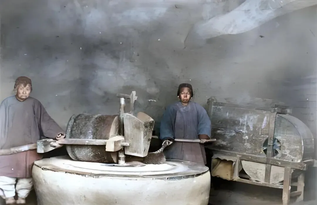 这两位妇人面前的圆石叫碾子,石盘白白的一圈面渣绕着走,木梁顶在肩窝里,慢慢推着让石磨转,墙角那台靠风力筛杂的风扇车静静立着,木壳子上有一道小窗,手一摇扇叶转动,轻的草屑被吹出去,沉的粮食留下来,爷爷说以前磨一斗粮得推半天,肩上勒出一道红印子,冬天屋里白气直冒,推完人热得开衫,出了门又被风一激哆嗦半天。