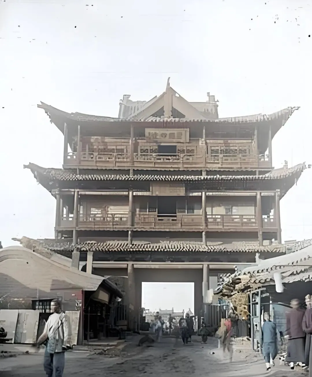 这座三层檐角飞起的叫鼓楼,木梁间还残着彩绘,近处屋檐压得很低,门洞正中像一只大口把街市吞进去,照片里日头偏西,阴影落在楼檐下,走过的人影被拉得老长,外地来的学者站在南面举着相机咔嚓一声,这样的画面就收进去了,后来城门楼拆了又筑,名字换来换去,老味道却再也补不全。