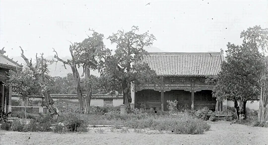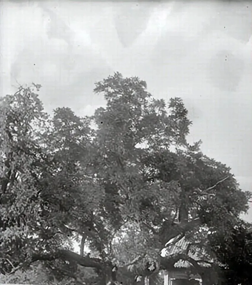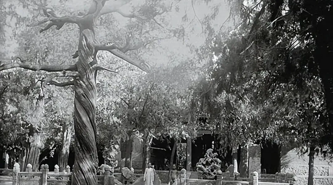 图中盘着筋的老树叫柏子,树皮扭成麻花一样的纹路,灰黑色的枝干从石栏上探过去,院里影影绰绰能见殿门一角,石雕狮子蹲在台阶旁边,那会儿庙里安静得很,风一过,松针抖两下就能听见。