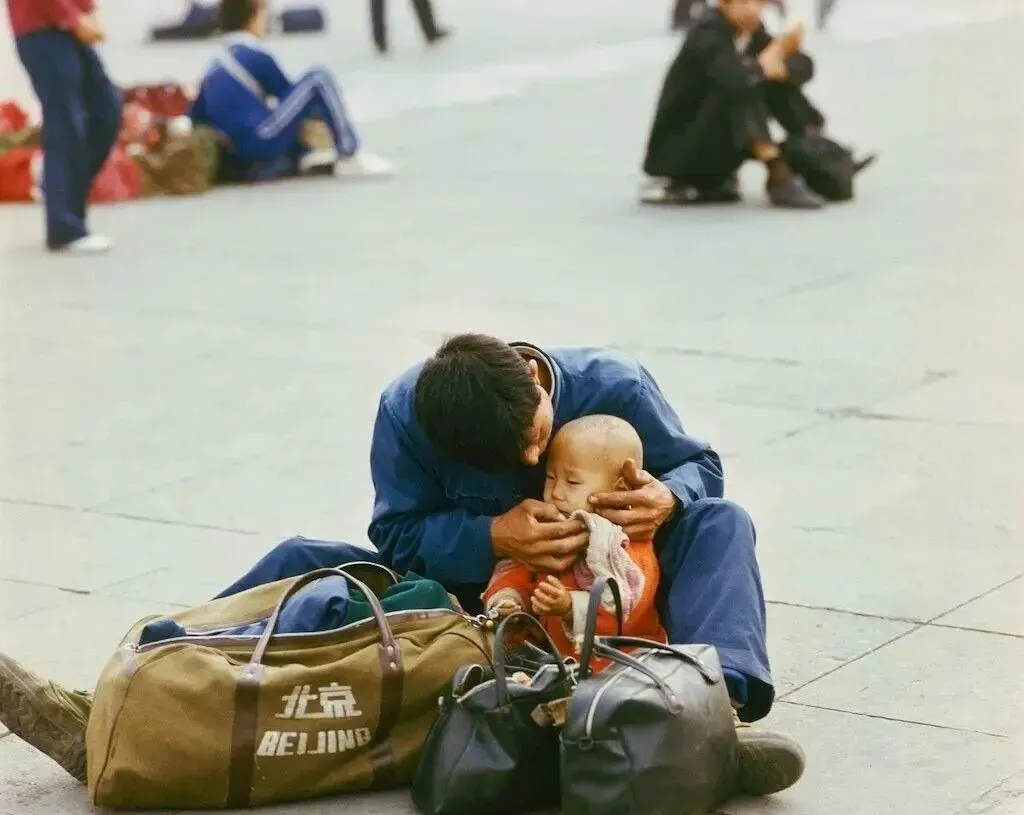 再看一眼这对父子,爸爸把孩子的小脸捧得严严实实,怕风灌进衣领里,帆布包边角磨得发白,鞋底有尘,赶路的人都懂这个姿势,困了就靠一会儿,醒了继续走,简单但踏实,这就是那时候的生活底色。