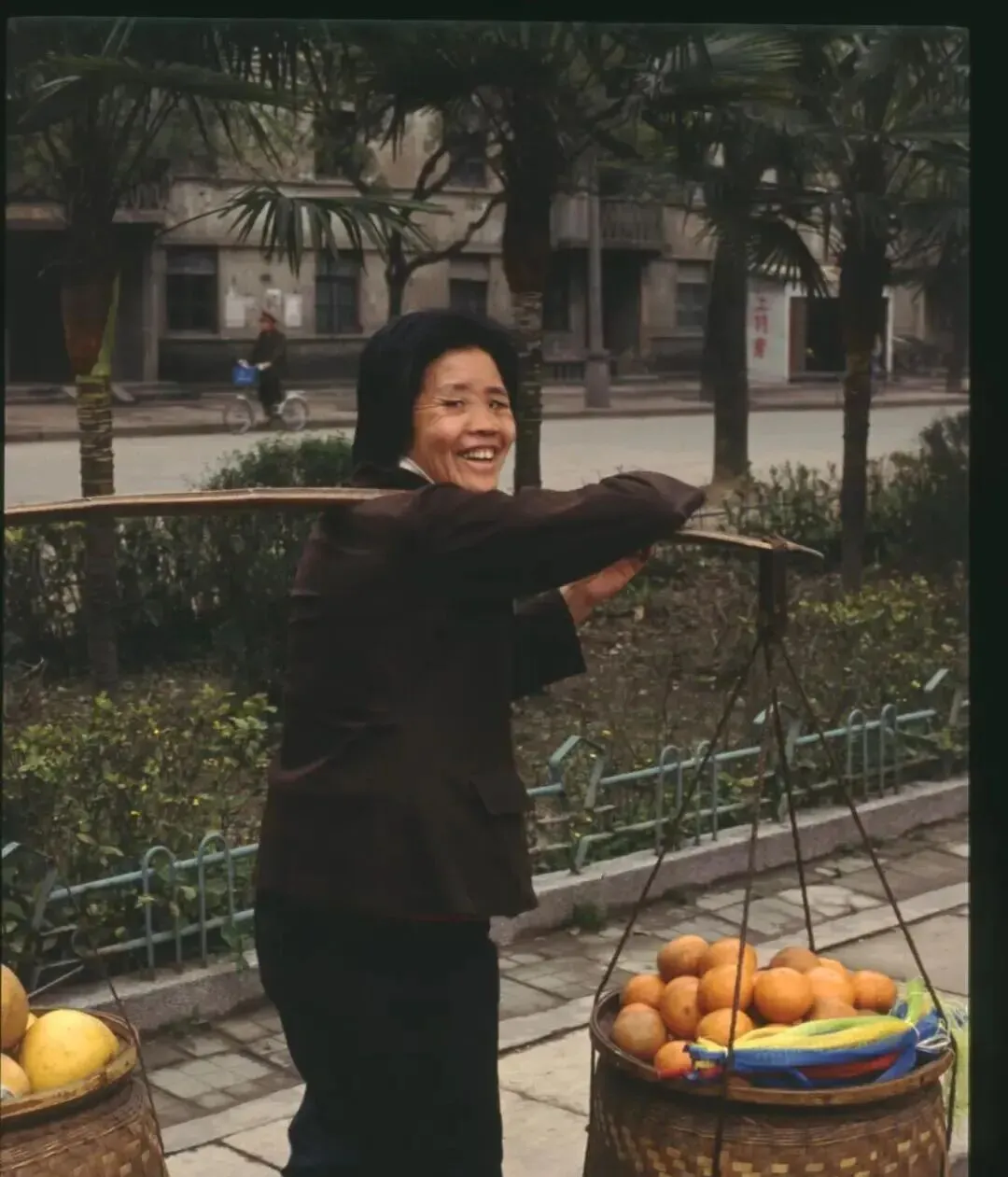 这根弯弯的竹扁担叫挑子,两头各挂一只篾编大篮,橘子装得圆滚滚的,篮口压着旧毛巾,卖货的人笑眯眯地吆喝一声甜得很哪,肩窝处长期磨出厚茧,妈妈说挑担讲究前重后轻,走起来就稳了。