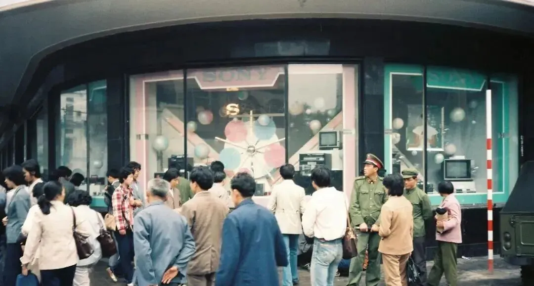 这排亮晶晶的玻璃橱窗里摆着收录机和电视,牌子醒目,大家不一定买得起,但一定要来看一眼,站在最前面的解放鞋都踮着脚尖儿,警察同志靠在杆子边上维持秩序,那个年代看个新鲜就是周末最大娱乐。