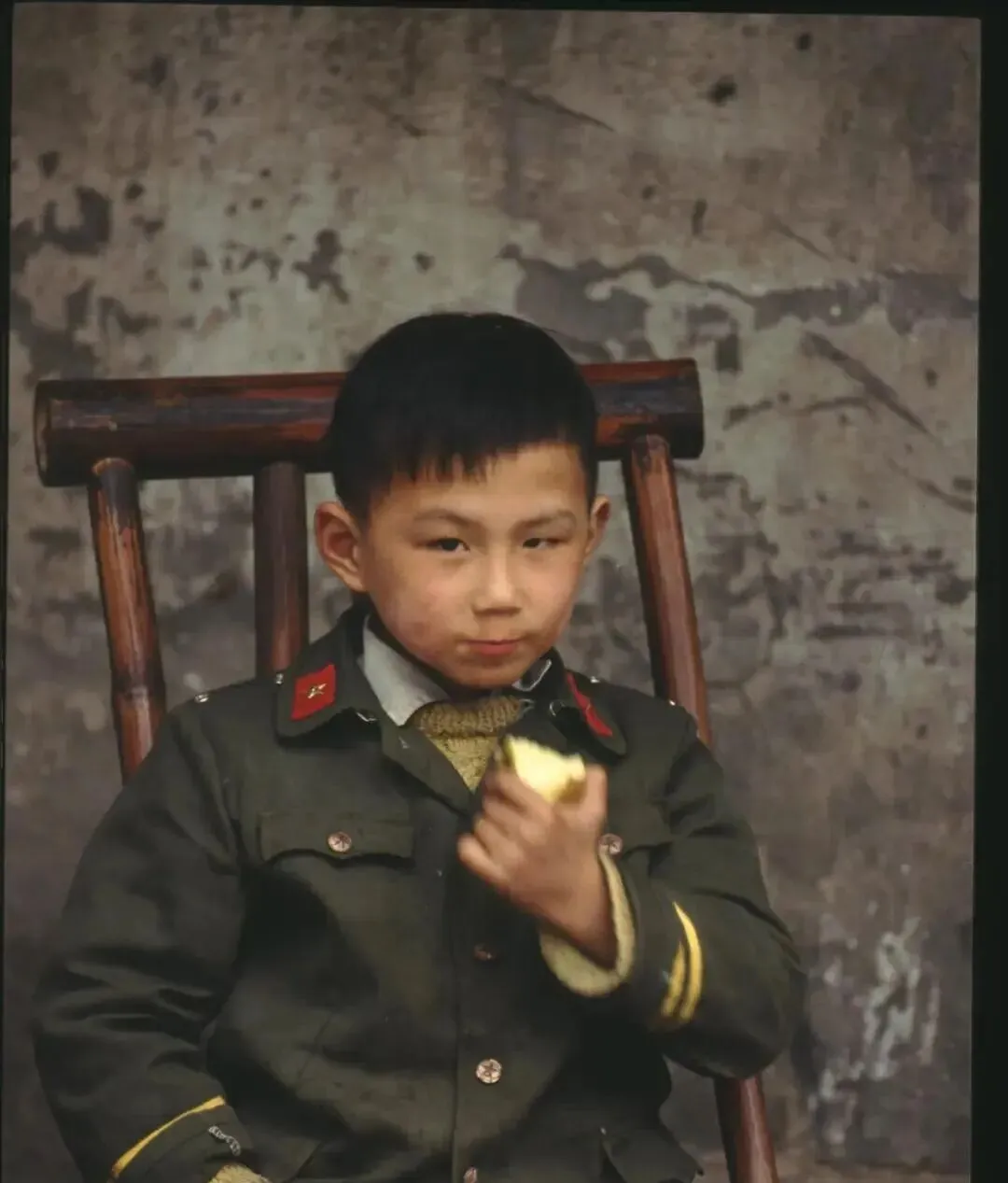 图里的小外套是仿军装校服,呢料硬挺,铜扣子带星标,袖口滚一圈黄边,小椅子是实木靠背,表面被小手摸得发亮,男孩攥着一块馒头边吃边瞧人,奶奶笑他嘴角白一道,擦擦再咬一口,热闹。