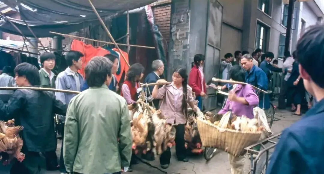这一溜挂满鸡鸭的竹担子,叽叽喳喳不消停,买卖双方絮絮叨叨还价,手心一拍成交,回家拔毛要用到煤油炉和铝盆,蒸汽一冒,屋里满是热气,那时候吃顿鸡可是过节的排面。