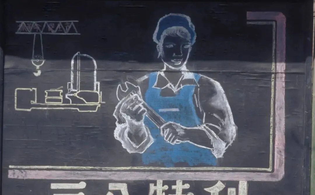 这个画面是女工黑板报,粉笔勾勒的扳手特别抢眼,奶奶看见笑,说我们那会儿也上班,穿蓝布工作服,扎头巾,手心一点不软,厂里开会,还能拿到流动红旗。