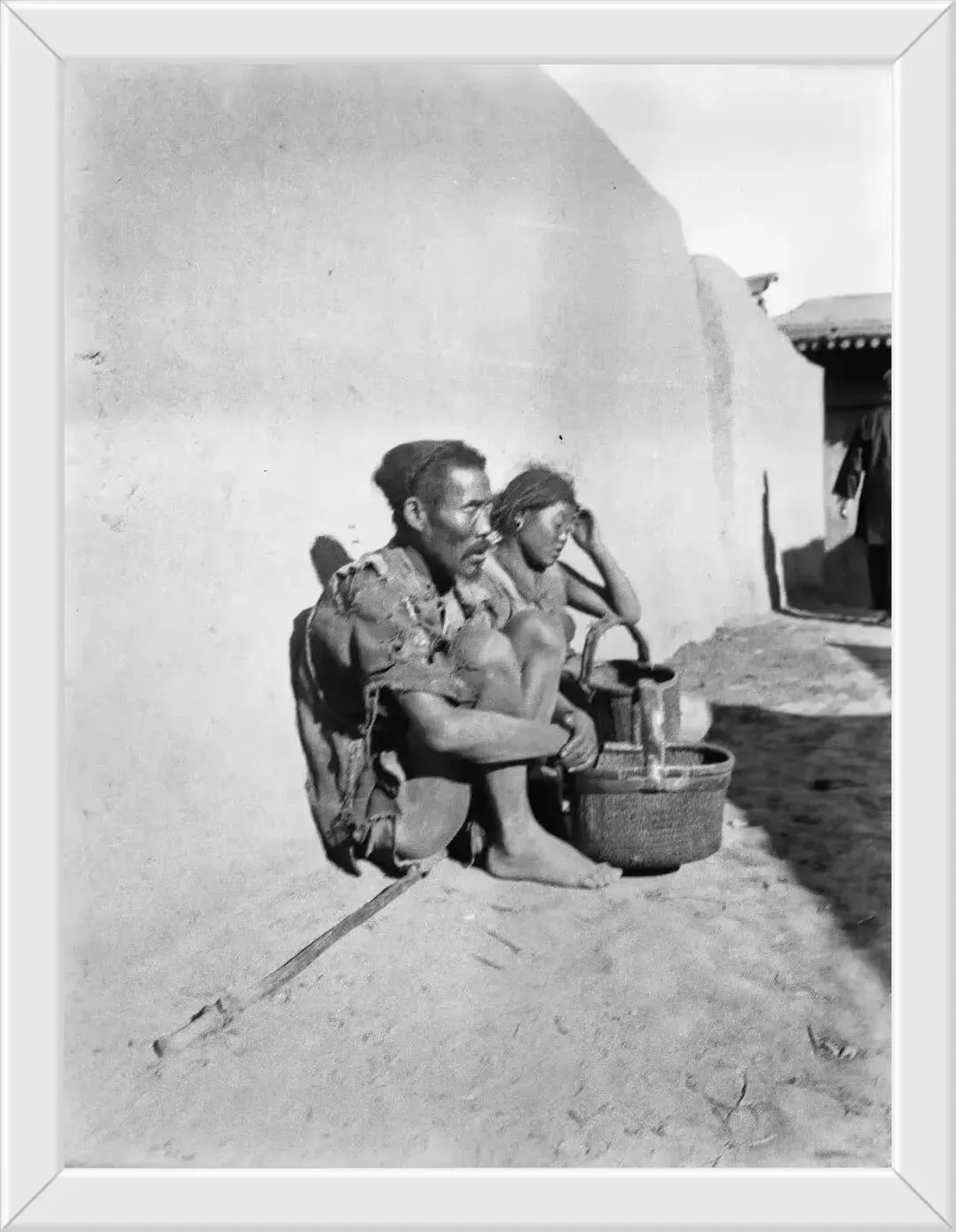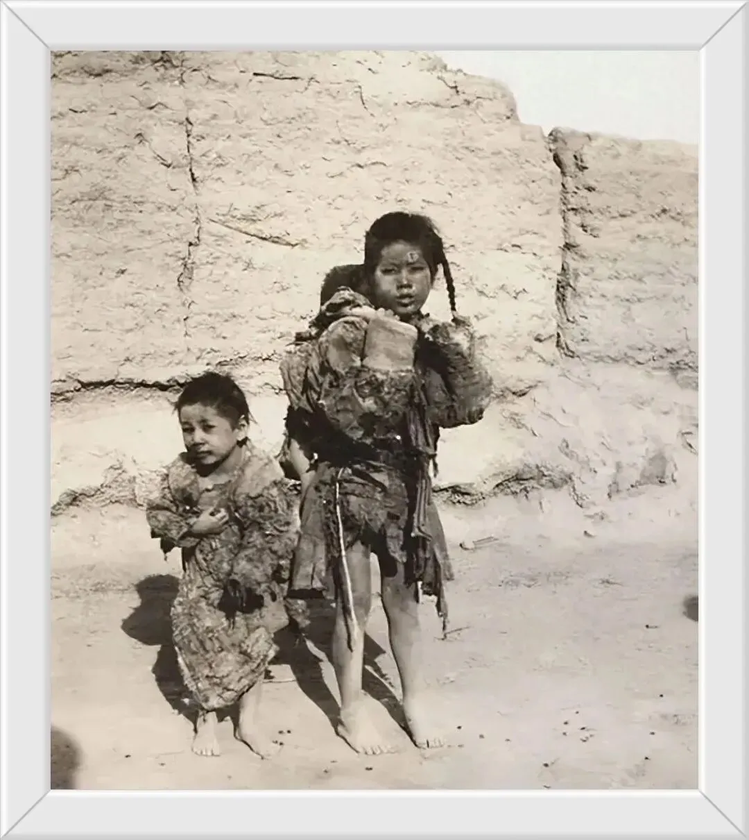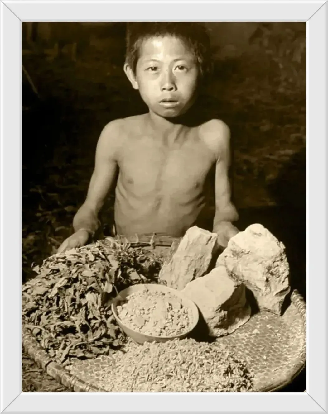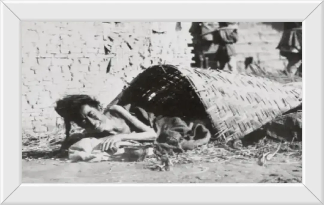 衣不蔽体的孩子簸箕里端的是家里仅有的一点吃的,树皮,草叶,还有那一块一块的不知道是什么?感觉是那种能吃的黄土。那时候吃不上喝不上,能存活就是幸福的。