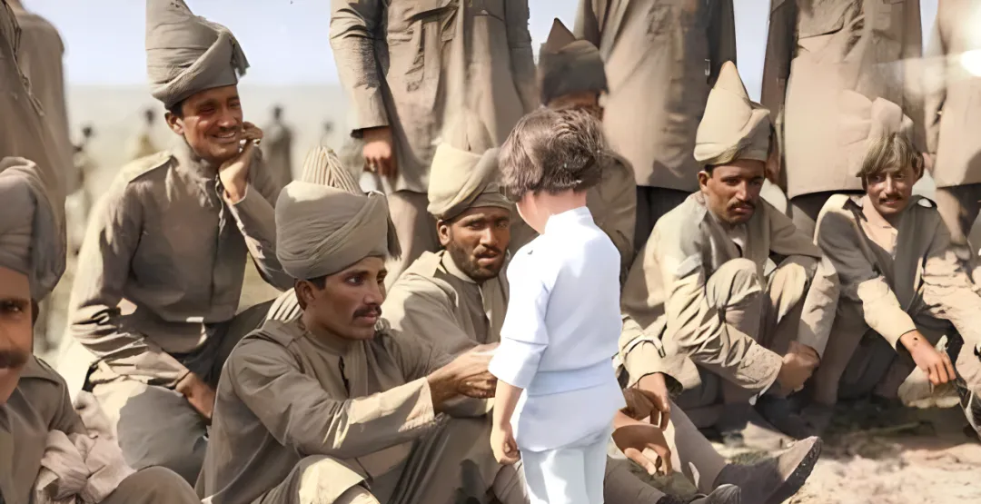 图中这群穿土黄色军装的人叫英属印度士兵,头上缠着高高的包头,布面起了毛边,袖口磨得发亮,脚边的尘土像细糖一样堆着,一个小男孩仰着脸,攥紧了其中一位士兵的手,这手指节粗大,掌心里全是干裂的沟壑,回握的时候却很轻,像怕弄疼孩子一样,旁边的战友有人咧嘴笑,有人眯着眼打量,阳光一照,军服上的沙粒泛着白光。