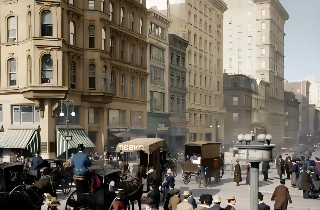 这个路口叫第五大道拐弯,左边一幢浅黄色的楼,窗框是深色的木,檐口压得很矮,像眉头紧皱,路面铺着浅灰石板,马车棚上罩着帆布,字母歪歪扭扭地画着广告,后面一辆方头卡车冒着烟,行人戴礼帽、呢帽、草帽,帽檐一圈圈像年轮,台阶口那根带球头的路灯杆,立在那里像个规矩人。