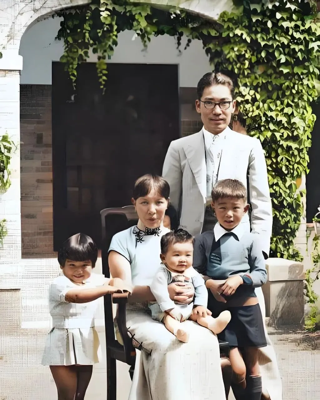图中这家子的站位有讲究,先生着一身浅色西装,镜框细细的,神情温润,太太坐在中间,旗袍领口压着黑色盘扣,怀里抱着奶娃娃,手臂微弯托着小背,左边的小女儿抓着椅把笑得见牙,右边的小男孩腰杆儿直直的,衬衫和背带把稚气勾了个圈,拱门上方攀着爬山虎,影子斑驳地落在墙上,照片上色后,布料的冷暖被拉开,白里见青,青里透灰,我小时候翻家里老相册,最爱看这种坐姿讲究的全家福,妈妈说那会儿拍照是件大事,孩子先抹一把脸,鞋带要系紧,不然上镜一辈子都散乱。