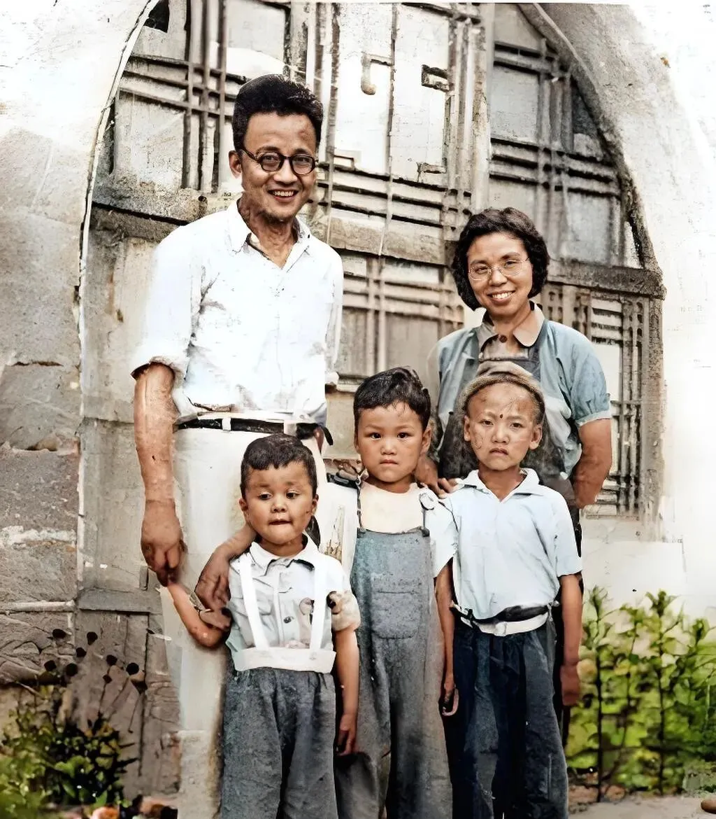 这张叫窑洞门口的家常相,男人瘦高,白衬衫扎进裤腰,笑纹把镜片都映亮了,女人在旁边微微一倾,穿一件淡青上衣,三个孩子站前排,脸上带着土渍,背带裤吊着,表情一个赛一个认真,像刚从地里跑回来还没喘匀气,旧时的日子不宽裕,可你看这神气,苦里也能挤出笑来,奶奶常说以前拍照要挑天晴,阳光一照,人的精气神就出来了。